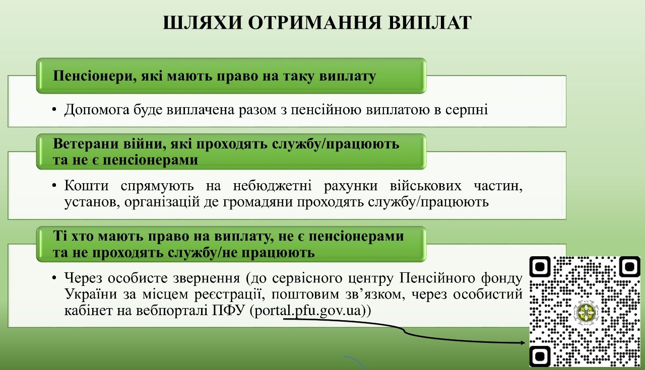 • Пенсіонери, які мають право на виплату, отримають кошти у серпні разом із пенсією. Звертатися за виплатою не потрібно.